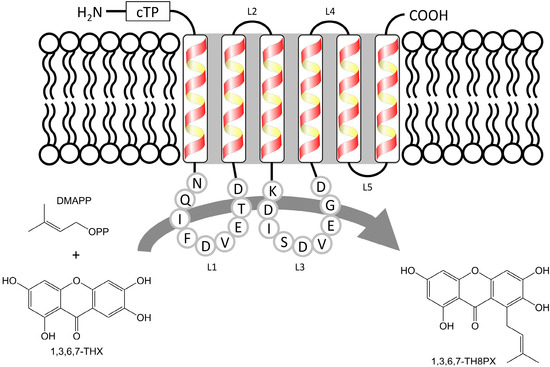- Ohara, K.; Mito, K.; Yazaki, K. Homogeneous purification and characterization of LePGT1— A membrane-bound aromatic substrate prenyltransferase involved in secondary metabolism of Lithospermum erythrorhizon. FEBS J. 2013, 280, 2572–2580. [Google Scholar] [CrossRef] [PubMed]