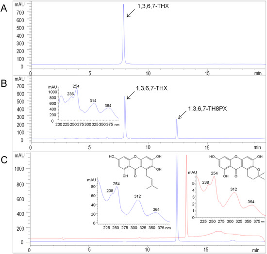 3.2. Synthesis of Trisammonium Dimethylallyl Diphosphate and 1,3,6,7-Tetrahydroxyxanthone