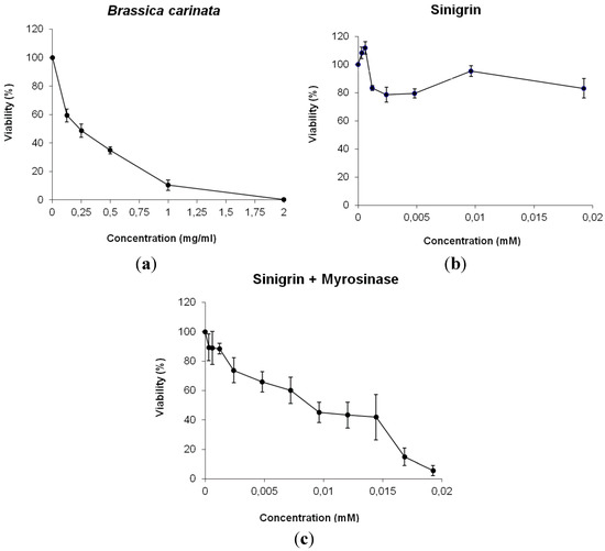 Survival of HL60 cultures treated with different concentrations of: (a) B. carinata; (b) sinigrin; (c) sinigrin + myrosinase. Curves are plotted as percentages with respect to the control counted from at least three independent experiments (mean ± SD). Correspondence: 1 mM sinigrin = 397.46 µg·mL−1 sinigrin.