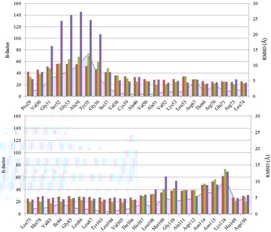 Minor fluctuations are observed for other residues (i.e., 67, 70, 74, 83, 84, 107, 109–112, 114, 115, 118, 148, 150–159, 163, 165–167). Among these, the region ranging from Met109 to Lys118 shows the highest RMSD values. Given the position of this region, the high fluctuation could be associated with the relative movement of the two lobes, as hypothesized by Nielsen et al. [].