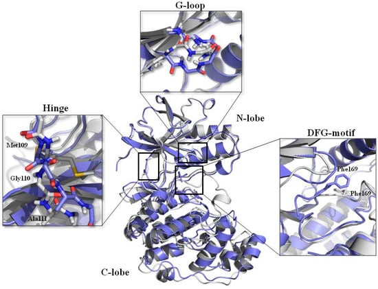 Many crystal structures of p38α MAPK in complex with different TI-I chemotypes have been reported so far (Table S1, Supplementary Materials) [], providing detailed information about the conformation of the ATP binding site and its interaction with ligands.