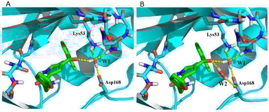 As protein targets, 82 structures were retained; moreover, some structures containing key crystal waters able to mediate ligand–protein interactions were used both with and without water. In particular, two water molecules are sometimes conserved across different structures (W1, found in 19 structures and mediating ligand/Lys53 interaction; W2, found in two structures and mediating ligand/Asp168 interaction; Figure 5 and Table S6). Each protein structure was named using its corresponding PDB code, adding −1W or −2W as suffix if one (W1) or two (W1 and W2) water molecules were present (representative examples in Figure 5).