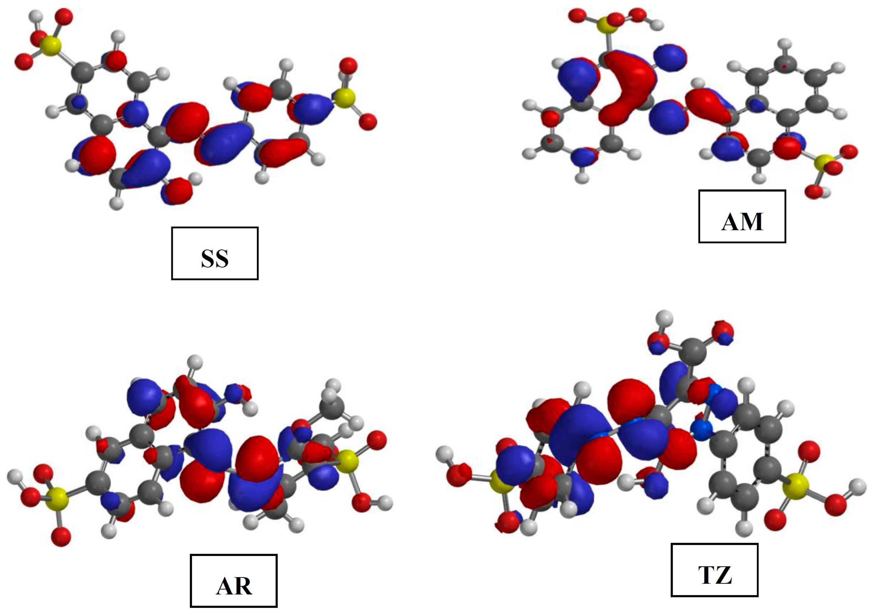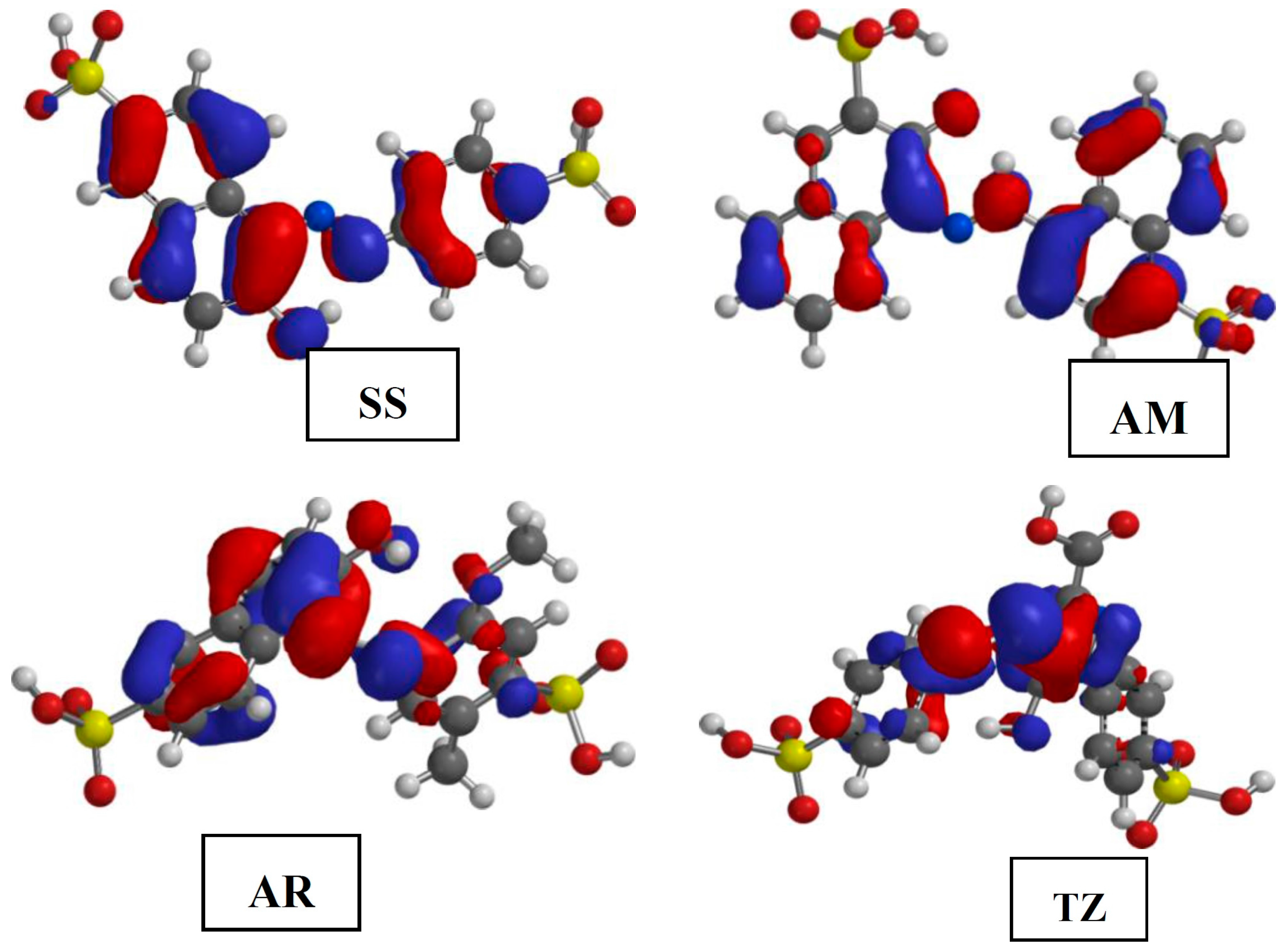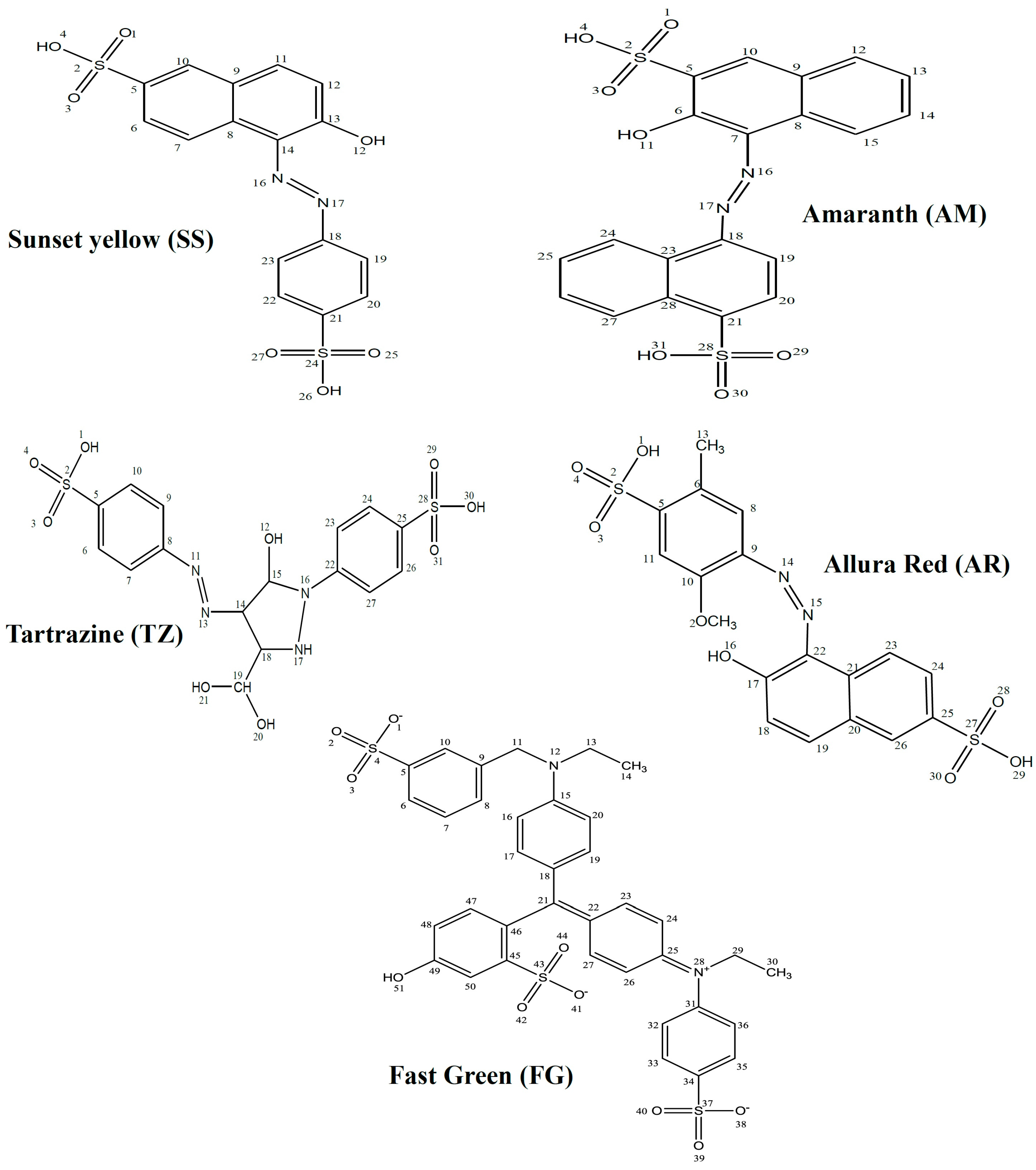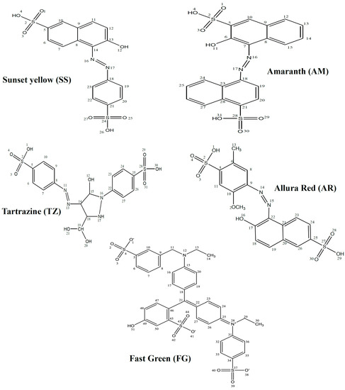 The present study is in furtherance of our ongoing research on the design and investigation of non-toxic organic compounds as corrosion inhibitors. With the exception of AM, the set of dyes used in this work are among the permitted dyes used as food, drug and/or cosmetics colourants according to the Federal Food, Drug and Cosmetic Act of the United States of America [36]. The aim of this work is to investigate the corrosion inhibition properties of five organic dyes namely Sunset Yellow (SS), Amaranth (AM), Allura Red (AR), Tartrazine (TZ) and Fast Green (FG) on mild steel in 0.5 M HCl using gravimetric method, potentiodynamic polarization technique and quantum chemical calculations. Since most of the previous works on corrosion inhibition studies on dyes did not relate experimental and quantum chemical results, we have included the correlations of quantum chemically derived molecular and electronic parameters with experimental results in the present work in order to provide better explanations for the adsorption and inhibition behaviour of the studied dyes at molecular levels. The effect of synergistic interactions of I− ions on the inhibition potentials of the dyes were also investigated. The molecular structures of the studied dyes are shown in Figure 1.
