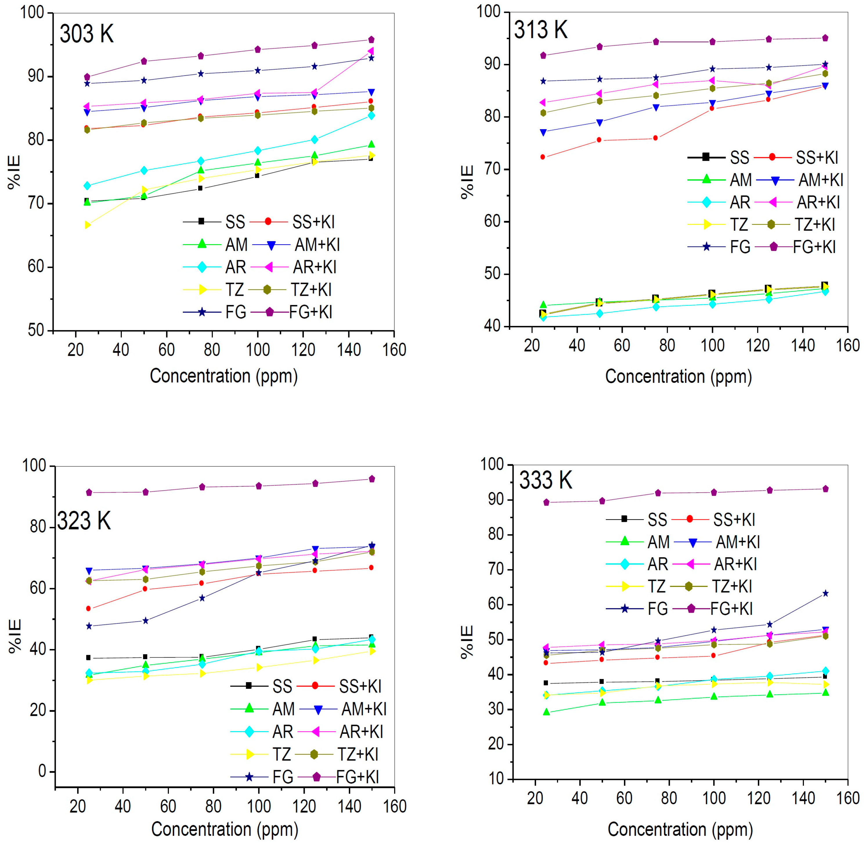 Inhibition efficiency against concentrations for the studied dyes without KI and with KI at 303–333 K.