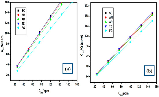 Langmuir adsorption isotherm plots for the adsorption of the studied dyes at 303 K (a) without KI and (b) with KI.