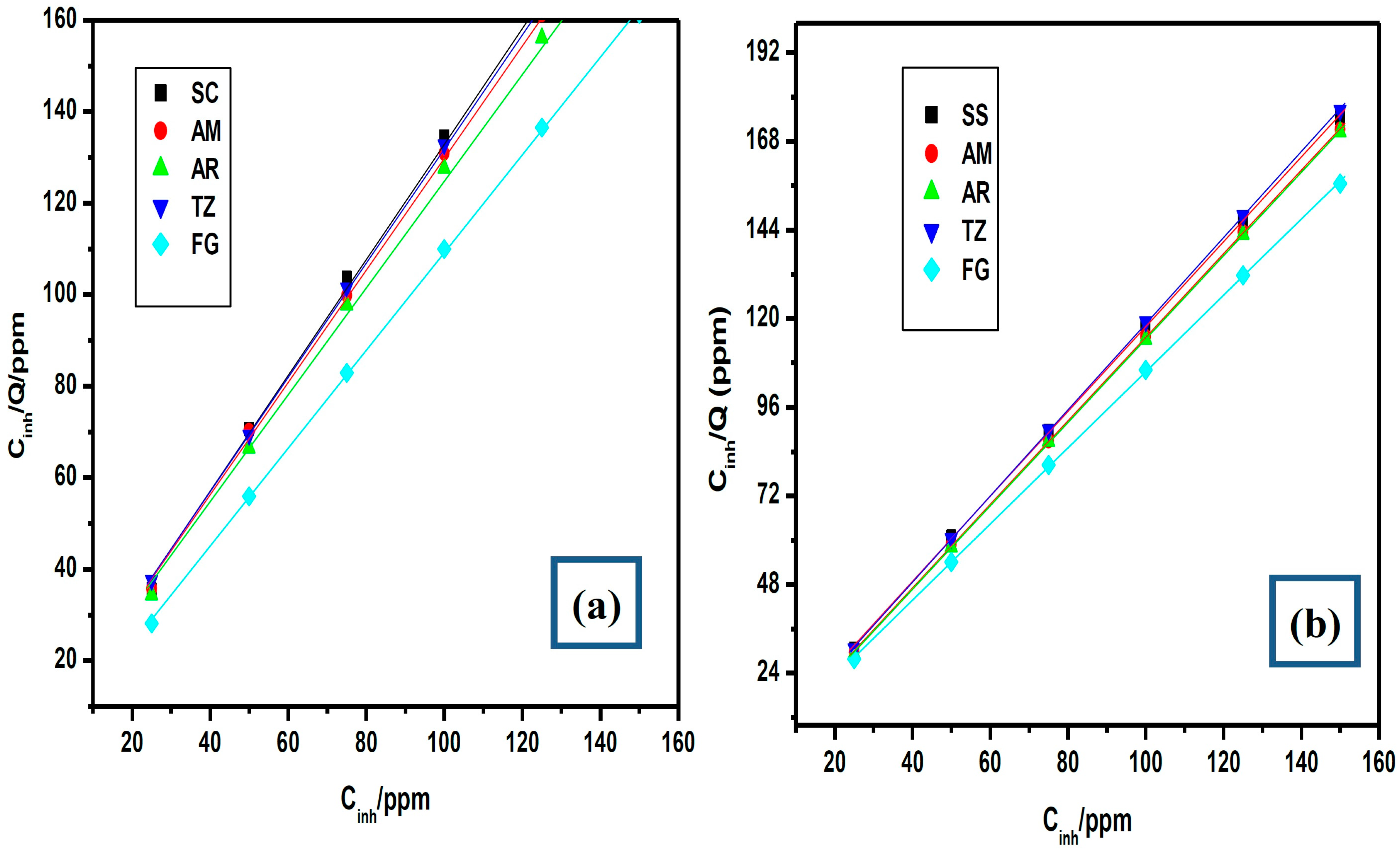 where θ is the degree of surface coverage, Kads is the equilibrium constant of the adsorption/desorption process and Cinh is the concentration of the inhibitor. Only the representative plots at 303 K are shown in Figure 3. Similar observations were made at other temperatures (but not reported here). The change in Gibb’s free energy of adsorption (Δ) was calculated using the equation: