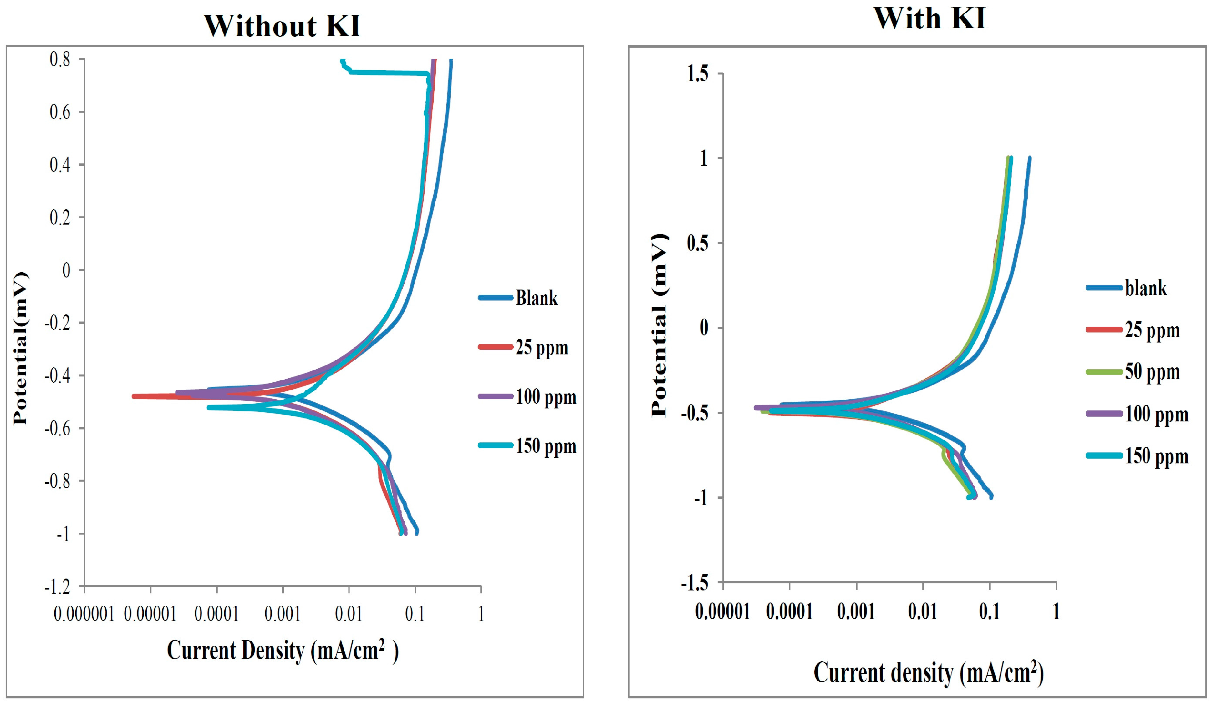Potentiodynamic polarization parameters such as corrosion rate, corrosion current density (icorr), corrosion potential (Ecorr), and anodic and cathodic Tafel slopes (ba and bc) and corrosion rate using different dye inhibitors with and without KI.