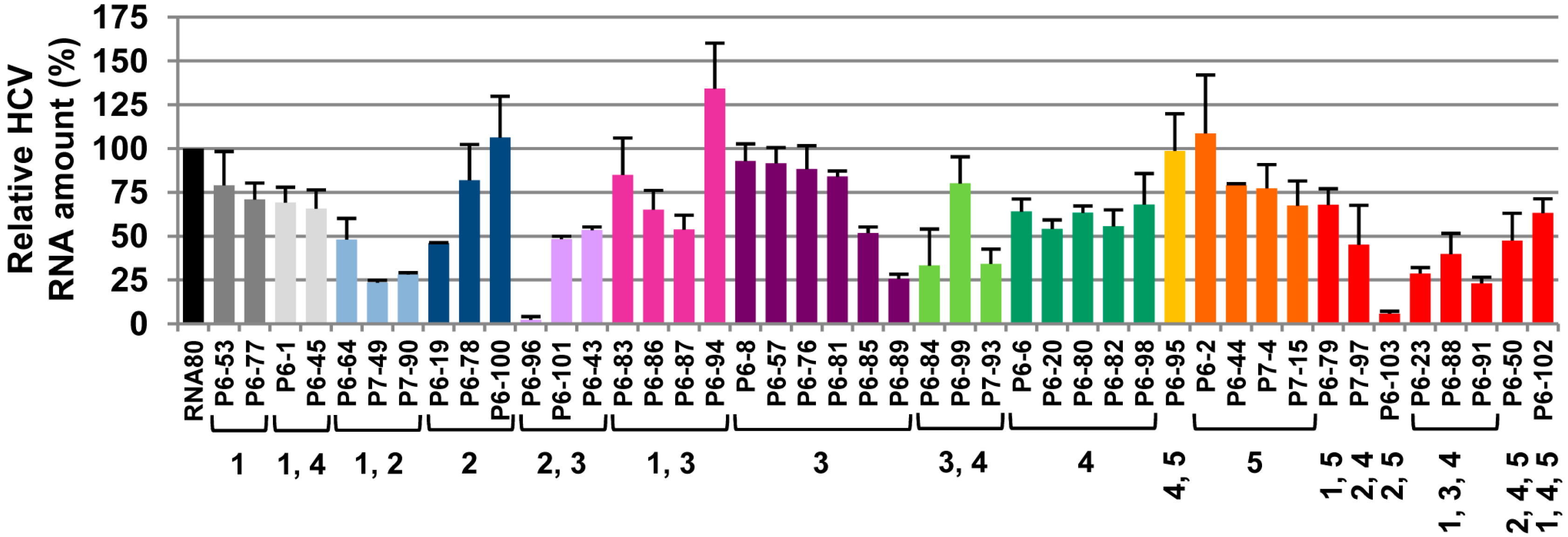 The results showed that around 35% of the tested aptamers promoted a significant reduction (>50%) in the relative HCV RNA levels (Figure 2). Four out of them—P6-89, P6-96, P6-103 and P7-49—reached inhibition values higher than 75%. An additional 30% also interfered with viral RNA synthesis at certain degree (30%–50%). These data argue for considering the CRE region as a potential therapeutic target.