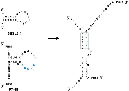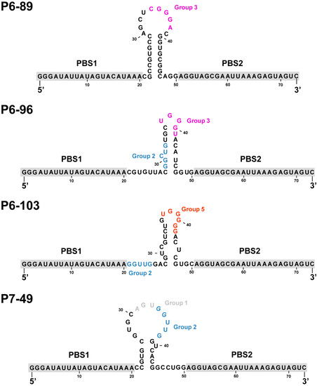 Theoretical model for the interaction between the 5BSL4 domain and the P7-49 RNA aptamer. CoFold and RNAup software were used to predict the nucleotides involved in the binding between the 5BSL4 stem-loop and the P7-49 aptamer. Residues proposed to initiate the kissing-loop interaction are boxed. Nucleotides belonging to groups 1 and 2 are colored as indicated in Figure 2. PBS, primer binding site.