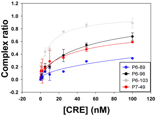 Binding affinity was analyzed by incubating a constant concentration of each 32P-internally labeled aptamer (~2 nM) with increasing amounts of the unlabeled construct CU [32], as detailed in the Experimental Section. This transcript CU bears the whole HCV CRE region from nucleotide 9181 (upstream of the 5BSL3.1 domain) plus the whole 3′UTR [28]. The titration curve showed differential interaction efficiency for the different aptamers under study (see Figure 4 and Table 2). Thus, aptamers containing the consensus motif from the group 2 (P6-96, P6-103 and P7-49) exhibited an efficient binding ability, with low Kd values and complex formation yields above 50% (Figure 4 and Table 2). The molecule P6-103 emerged as the most efficient interacting partner for the CRE, with a Kd value of 9.47 ± 3.49 nM and an extension complex formation of 1.04 ± 0.14. Interestingly, besides on bearing the group 2 consensus sequence, this aptamer contains the motif for group 5, which interacts with the translation stop codon. Finally, the variant P6-89, which targets the internal loop of the 5BSL3.2 domain (group 3), appeared as the less effective binder, with calculated Kd values in the range of low micromolar (see Figure 4 and Table 2).