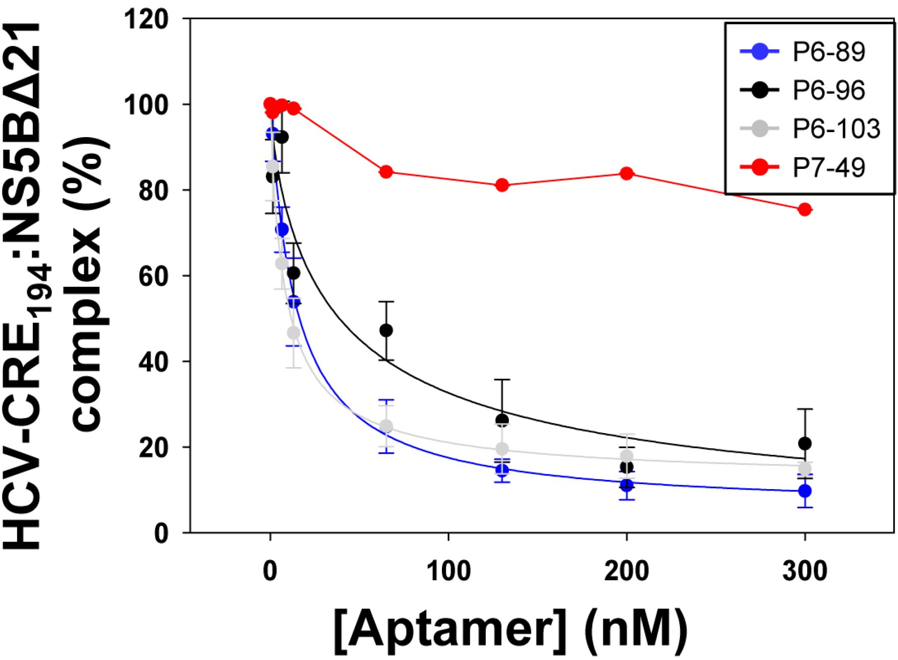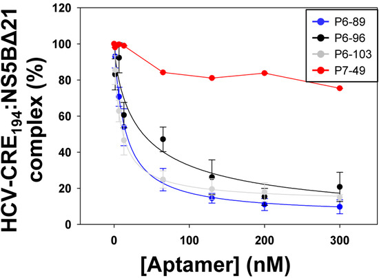 It has been described that the 5BSL3.2 domain binds to the viral NS5B protein [29,30]. Since some of the tested inhibitors harbor complementary sequence motifs to the 5BSL3.2 domain, it seemed reasonable to monitor whether the aptamers P6-89, P6-96, P6-103, and P7-49 could compete with the viral polymerase recruitment, as the replication inhibition mechanism. For that purpose, the aptamers were subjected to in vitro binding assays with the transcript HCV-CRE194 in the presence of the recombinant protein NS5BΔ21. Increasing concentrations of the aptamers under study were employed and the EC50 value was calculated.