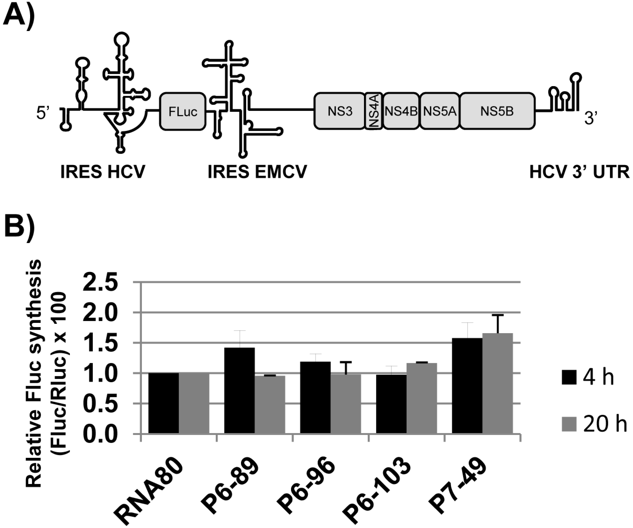 Aptamers P6-89, P6-96, P6-103, and P7-49 contain sequence motifs complementary to functional RNA domains that are involved in the regulation of HCV translation, such as the 5BSL3.2 [22] and the stem-loop containing the stop codon. This observation led us to study their role on viral protein synthesis in cell culture translation assays. With that aim, a mixture containing the so-called transcripts cap-RLuc, Rep-FLuc, and a 20-fold molar excess of the aptamers or the non-related RNA80 was used to transfect Huh-7.5 cells. The molecule Rep-FLuc bears a dicistronic reporter subgenomic replicon construct in which the neo selectable marker is substituted by the reporter gene fluc from the Firefly spp., whose translation is controlled by the HCV IRES region [41] (Figure 6A). This strategy allows to measuring the IRES activity in the early post-transfection period (4–20 h).