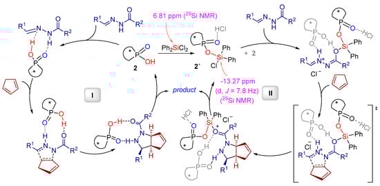 Proposed mechanisms for [3+2] cycloaddition reaction by using BINOL-phosphate alone (I) and applying BINOL-phosphate/Ph2SiCl2 (2:1) as a catalytic system (II).