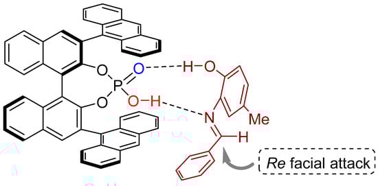 Based on an observed positive nonlinear effect ((+)-NLE), a mechanistic model was proposed, accounting for the involvement of more than one molecule of the chiral phosphoric acid in the transition state structure (Figure 7).