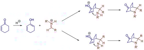Furthermore, these authors proposed a possible mechanism, as outlined in Figure 6. At first, cyclohexenone is enolized, undergoing a Mannich reaction with the protonated aldimine, which has been activated by the chiral phosphoric acid catalyst. Subsequently, the final cycloaddition products are generated through a tandem intramolecular 1,4-addition reaction (Figure 6).