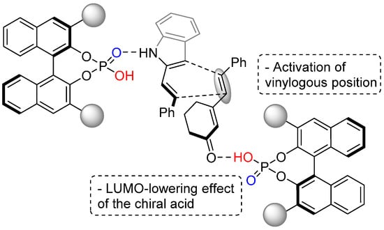 Several research groups have already reported the application of BINOL-phosphates in numerous highly enantioselective transformations [6,7,8,9,10,11]. In most cases the key aspect of catalysis is the bifunctional character (Brønsted acid/Lewis base) of the phosphoric acid moiety. Asymmetric catalysis in the cycloaddition reactions (e.g., [3+2], formal [3+3], [4+2], vinylogous [4+2] and 1,3-dipolar cycloadditions) has also been successfully realized using chiral Brønsted-acid catalysts and opened up a promising new frontier in organic synthesis.