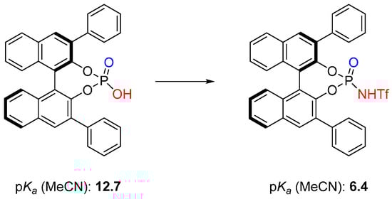 An approach to circumvent such limitation was earlier reported by the Koppel group via a modification of the acid moiety to increase its acidity. The effect of stepwise replacement of =O oxygen atoms by =NTf fragments in the sulfonyl group of toluene-p-sulfonamide and benzenesulfonamide on their acidity has been studied by Koppel and co-workers and it was demonstrated that the pKa of organic acids can be dramatically decreased and, thus, the activity of the corresponding catalyst can be raised [29,30].