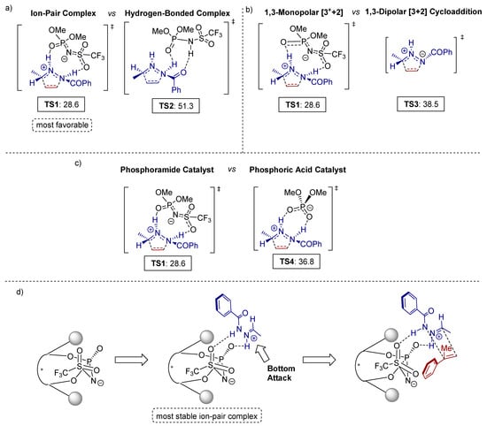 There are two possible pathways for the complexation of the hydrazone and the phosphoramide: either through proton transfer (ion-pair complex formation) or through hydrogen-bonding. Based on calculated Gibbs free energies, transition state TS1 (Figure 11a), resulting from a proton transfer of the Brønsted acid to the hydrazone, is energetically most favorable among all transition states with ion-pair complexes. Additionally, a comparative energy profile of the monopolar [3++2] and the competitive dipolar [3+2] cycloadditon revealed a lower overall barrier (28.6 kcal/mol) for the monopolar cycloaddition (Figure 11b). Thus, the proton transfer from the Bronsted acid to the hydrazone is essential for the catalytic efficiency, being therefore the predominant pathway. Furthermore, the obtained data demonstrate that the phosphoric acid is not capable of protonating the hydrazone due to its lower acidity compared to the N-triflyl phosphoramide analogues (Figure 11c), generating a hydrogen bonded-complex instead. To achieve the “ion pair”-geometry, necessary for the [3+2] cycloaddition transition state, a large distortion of the hydrogen-bonded complex is required, and, hence, the reaction barrier for this catalytic pathway turns out to be significantly higher (36.8 kcal/mol).