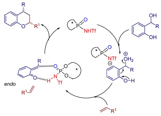 The authors, moreover, proposed a reaction mechanism (Figure 12), further supported by NMR studies, which unveils the in situ generation of ortho-quinone methides (o-QM) via initial protonation of the corresponding ortho-hydroxybenzyl alcohol by the Brønsted acid. The catalyst then complexes the intermediary o-QM via hydrogen bonding and further stabilizes the methylene group of the o-QM with aid of the lone pair of the phosphoryl oxygen atom of the catalyst. In this transition state one face of the heterodiene is shielded by the catalyst allowing the alkene to attack selectively in an endo fashion.