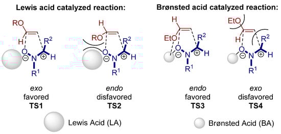 Transition-state structures showing the diastereoselectivity of the 1,3-dipolar cycloaddition of nitrones catalyzed by LA and BA.