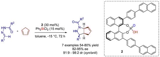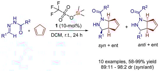 As a result, in 2011, Tsogoeva and co-workers demonstrated for the first time that the [3+2] cycloaddition reaction between N-acylhydrazones and cyclopentadiene can be successfully performed in high yields (up to 99%), with diastereoselectivity up to 98:2 dr using catalytic amounts of TMSOTf (trimethylsilyl triflate, 1) as readily available achiral silicon Lewis acid catalyst (Scheme 1) [12,14].