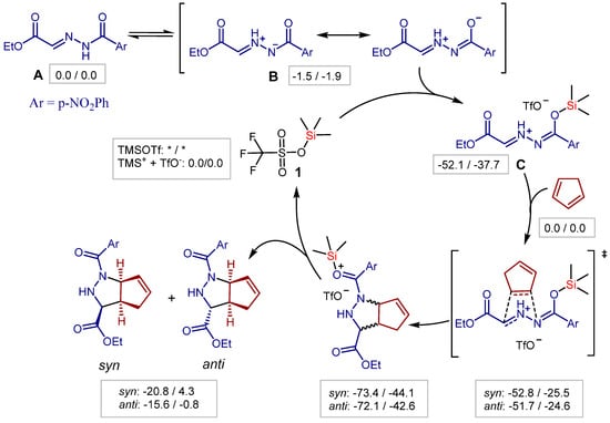 It was found that the hydrazone isomer B is stabilized relative to A. The DFT results suggest that, once B emerges, a complex C with the Lewis acidic silicon center is formed. Since the triflate is an excellent leaving group, it is eliminated when the catalyst approaches. From this point, the calculations suggest a plausible mechanistic pathway, which is based on the formation of a stable Si-O-bond.