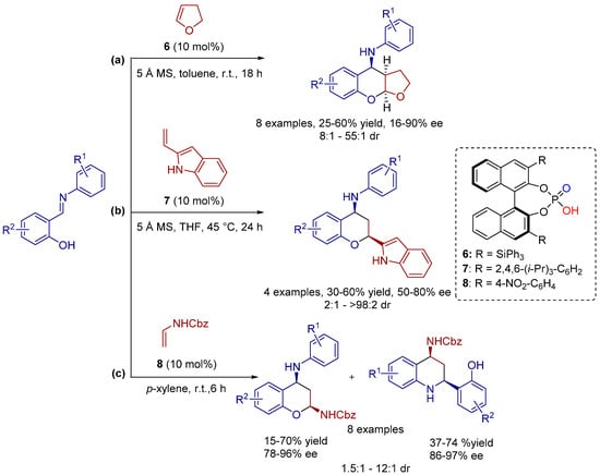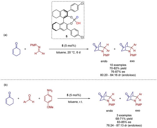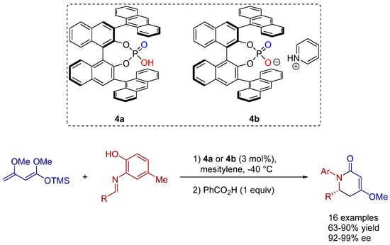 - Borovika, A.; Nagorny, P. Chiral brønsted acid-catalyzed enantioselective ionic [2+4] cycloadditions. Tetrahedron 2013, 69, 5719–5725. [Google Scholar] [CrossRef]