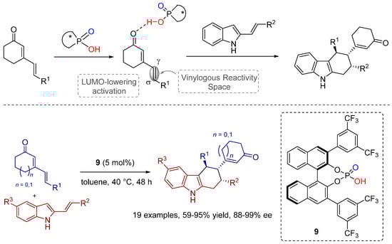 In this context, cyclic 2,4-dienones have been proven to be suitable dienophiles for the synthesis, applying 2-vinylindoles as electron-rich dienes, and using chiral phosphoric acids as catalysts (Scheme 8). The variety of the substrate scope indicates the high potential and generality of the reaction.