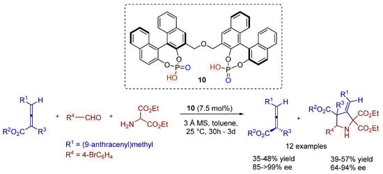 In 2010, Gong and co-workers developed a kinetic resolution of racemic 2,3-allenoates via 1,3-dipolar cycloaddition by using bisphosphoric acid catalyst 10. This method enables convenient access to both 2,3-allenoates and 3-methylenepyrrolidine derivatives, which are important precursors and/or subunits of biologically active compounds (Scheme 9) [18].