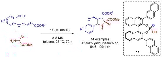 The same research group disclosed an elegant chiral Brønsted acid-catalyzed 1,3-dipolar cycloaddition of α-aryl amino esters with aldehydes bearing dipolarophile functionalities towards hexahydrochromeno[4,3-b]pyrrolidine derivatives with high levels of enantioselectivity (Scheme 10) [19]. The reaction outcome depends on the nature of the α-arylglycine methyl esters and the aldehydes, respectively. For instance, the use of α-arylglycine methyl esters with electron withdrawing aryl substituents is positively correlated to high levels of enantioselectivity.