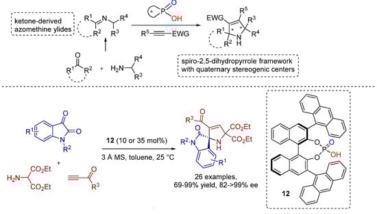 In 2013, Shi, Tu and co-workers reported the first catalytic asymmetric 1,3-dipolar cycloaddition of alkynes with isatin-derived azomethine ylides using chiral Brønsted acid catalyst 12 providing biologically important spiro-oxindole-based 2,5-dihydropyrrole frameworks (Scheme 11) [20].