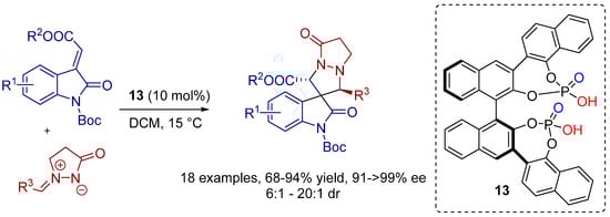 In 2013, Hong, Wang and co-workers developed a novel chiral bisphosphoric acid 13 bearing triple axial chirality as excellent catalyst for the generation of spiro[pyrazolidin-3,3′-oxindoles] via a 1,3-dipolar cycloaddition reaction of methyleneindolinones and N,N′-cyclic azomethine imine (Scheme 12) [22]. While some of the desired products were obtained with only moderate diastereoselectivity, the yields and enantioselectivities were excellent for a wide range of diverse substituted spiro-oxindoles.