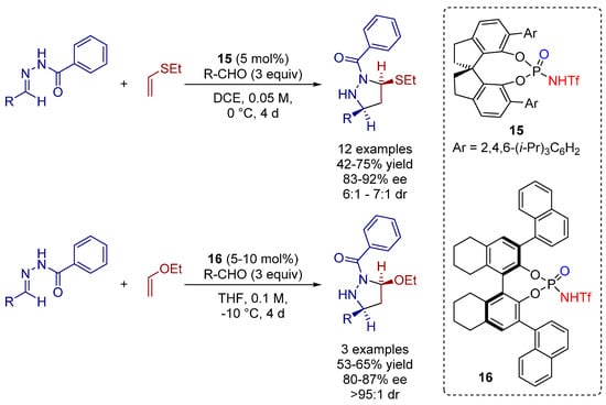 The abovementioned approach towards enantiomerically enriched pyrazolidines was further pursued by the groups of Rueping and Houk in 2014. SPINOL-derived N-triflyl phosphoramide 15 was applied as a suitable catalyst for the [3++2] cycloaddition between hydrazones and ethyl vinyl thioether towards a series of polysubstituted pyrazolidines with excellent enantioselectivity throughout (Scheme 14) [34].