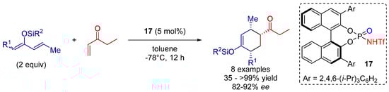 In 2006, the first N-triflyl phosphoramide catalyst was developed by Yamamoto and co-workers for the asymmetric Diels-Alder reaction of ethyl vinyl ketone and different silyloxydienes. The reaction is highly endo-selective and the cyclohexenes were obtained in moderate to excellent yields and good to excellent enantioselectivities (Scheme 15) [31].