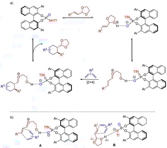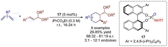 In 2013, Nagorny and co-workers described the first example of an asymmetric chiral N-triflyl phorsphoramide-catalyzed ionic [4+2] cycloaddition reaction between α,β-unsaturated acetals and different dienes (Scheme 16) [35].