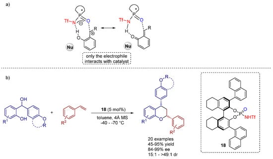 Recently, the Rueping group reported the Brønsted acid catalyzed [4+2] hetero-Diels-Alder reaction between unactivated alkenes and in situ generated ortho-quinone methides (from ortho-hydroxybenzyl alcohols) for the synthesis of chiral chromanes bearing multiple stereogenic centers with excellent diastereo- and enantioselectivities by the aid of a N-triflyl phosphoramide catalyst 18 (Scheme 18). Remarkably, the reaction proceeds via an open transition state with an exclusive activation of the electrophile, whereas the nucleophile does not interact with the catalyst [36].