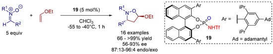 In 2008, Yamamoto and co-workers carried out a 1,3-dipolar cycloaddition reaction catalyzed by a N-triflyl phosphoramide catalyst 19. Within their studies they additionally emphasized the difference between Brønsted and Lewis acid catalysts (Scheme 19) [37].