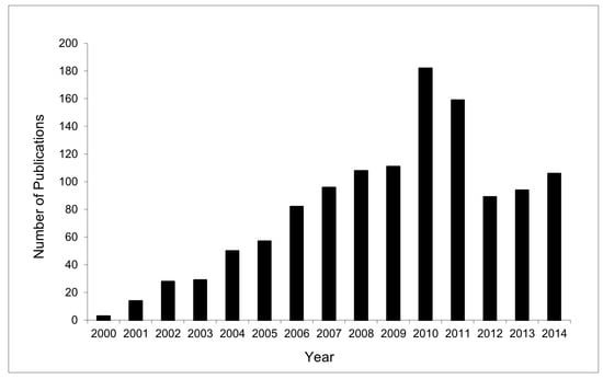 The first examples of the use of biocatalysts in the presence of an ionic liquid were reported by Erbeldinger et al. [] and Lau et al. [] in 2000. Since then, a large amount of research has been performed in this field as illustrated by Figure 1, which summarizes the number of publications per year from 2000. The number of issued or pending patent applications mirrors a similar trend. The importance of this rapidly growing field of research has been documented by various authors, including the different research groups of Sheldon et al., Kragl et al. and Goto et al., highlighting practical developments, as well as providing compilations of data for different ionic liquids/enzyme combinations [,,,,,,,,,,,,]. Collectively, these works have summarized different facets of the use of biocatalysts in ionic liquids, wherein key issues related to the effects of ionic liquids on the structure, activity and stability of enzymes have been explored and the impact of the water content in the ionic liquid assessed, together with several biocatalytic reactions employing a range of different enzymes and ionic liquid combinations for the design of reaction systems, including biocatalyst recovery, product isolation and choice of biphasic systems.