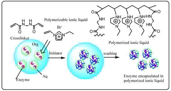 - Nakashima, K.; Kamiya, N.; Koda, D.; Maruyama, T.; Goto, M. Enzyme encapsulation in microparticles composed of polymerized ionic liquids for highly active and reusable biocatalysts. Org. Biomol. Chem. 2009, 7, 2353–2358. [Google Scholar] [CrossRef] [PubMed]