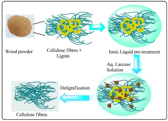 - Moniruzzaman, M.; Ono, T. Ionic liquid assisted enzymatic delignification of wood biomass: A new green’ and efficient approach for isolating of cellulose fibers. Biochem. Eng. J. 2012, 60, 156–160. [Google Scholar] [CrossRef]