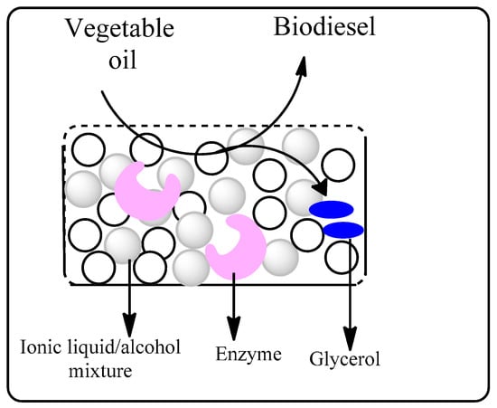 Biodiesel is a transport fuel that consists largely of fatty acid methyl esters (FAMEs) prepared by transesterification of natural triglycerides in plant oils or animal fats with methanol. These fuels have generated interest as renewable, low-carbon impact alternatives to fossil fuels. Current biodiesel production uses homogenous alkaline catalysts for transesterification and although this process is efficient, it complicates downstream product separation and increases energy costs []. Biocatalytic production of biodiesel in ionic liquids merits consideration as a green and potentially environmentally friendlier alternative to eliminate issues associated with product separation, homogenous catalyst recycling and energy consumption. The first demonstration of the potential of biocatalytic biodiesel production in ionic liquids was reported by Ha et al. [], who used the Novozym® 435 lipase to catalyze the transesterification of soya bean oil with methanol. 1-Ethyl-3-methylimidazolium trifluoromethanesulfonate ([Emim][TfO]) was found to be the best solvent, giving an 80% yield of fatty acid methyl esters in 12 h compared to 65% in tert-butanol and 10% under solvent-free reaction conditions. An additional advantage of the ionic liquid system was phase separation of the biodiesel as it was formed. Gamba et al. subsequently developed an efficient biphasic system for biodiesel production comprised of a [bmim]bis(trifluoro-methylsulfonyl)-imide ([NTf2]) ionic liquid phase containing methanol and lipase, and a soya bean oil phase (Figure 4) [].