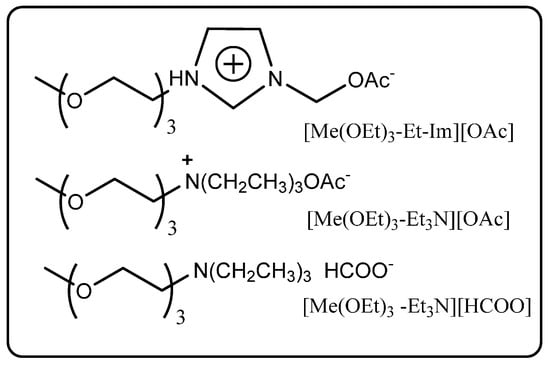 Further, Zhao et al. have reported the synthesis and application of novel triethyleneglycol-functionalised ionic liquids (Figure 5) in biodiesel production []. These ionic liquids dissolved both triglycerides and lipases, and a high level of catalytic activity was observed with different commercially available lipases; quantitative conversions of Miglyol® oil 812 prepared from coconut and palm kernel oils was achieved at 96 h in a 70/30 (v/v) ionic liquid/MeOH mixture. Overall, these preliminary studies on the transesterification of vegetable oils in ionic liquids indicate they are promising solvent systems for industrial biocatalytic biodiesel production.