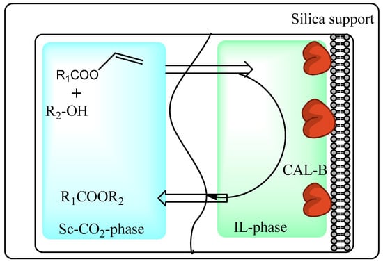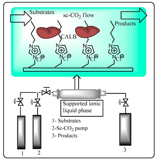 Continuous flow reactor setup employing CALB supported on an immobilized ionic liquid phase and sc-CO2 as a mobile phase [].