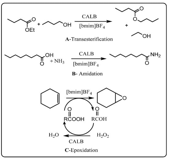 Candida antarctica lipase (CALB)-catalyzed transesterification (A); amidation (B) and epoxidation (C) reactions in ionic liquids [].