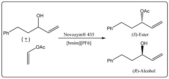 The important roles that enzymes can play as catalysts are particularly prominent in enantioselective transformations. Pioneering examples of enantioselective reactions using enzymes in ionic liquids were demonstrated independently in 2001 by Schöfer et al. [] and Itoh et al. []. For example, Itoh et al. [] carried out the enantioselective acylation of allylic alcohols in an ionic liquid solvent. The group successfully demonstrated that the lipase Candida antarctica lipase B (Novozym® 435) was anchored to the imidazolium based ionic liquid solvent. These experiments documented the power of a recyclable system of enzyme and ionic liquid for enantioselective transformation (Scheme 2). Overall, these demonstrations of the potential of lipase-catalyzed reactions in ionic liquids [,,] represent landmark studies, since lipases are now the most widely used enzymes in organic synthesis.