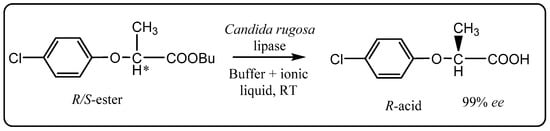 Subsequent to this pioneering study of lipase-catalyzed biocatalysis in ionic liquids, several other different reactions encompassing a wider array of substrates have been reported [,,]. For example, Mohile et al. have demonstrated the use of ionic liquid as a co-solvent with aqueous buffer for the Candida rugosa lipase-catalyzed enantioselective hydrolysis of racemic butyl 2-(4-chlorophenoxy)propionate (Scheme 3) [].