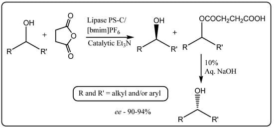 In biphasic systems employing the hydrophobic [bmim][PF6] or 1-hexyl-3-methyl-imidazolium [hmim][BF4] ionic liquids, reaction times increased by about 10-fold compared to when an aqueous buffer alone was employed, but a remarkably large enhancement in enantioselectivity up to 99% compared to 47%, respectively, was observed. Similar results have been obtained with a monophasic system when the more hydrophilic [bmim][BF4] ionic liquid was used. In the case of the biphasic systems, the ionic liquids were able to be recycled with only marginally reduced conversion rates after four cycles and with no loss of enantioselectivity. In subsequent work [bmim][PF6] was assessed as a solvent for the resolution of racemic alcohols by enantioselective acylation with succinic anhydride using Pseudomonas cepacia lipase supported on celite (lipase PS-C) as a catalyst (Scheme 4) [].