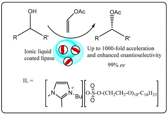 Similarly, Itoh et al. [] have prepared a 1-butyl-2,3-dimethylimidazolium [bdmim][cetyl-PEG10-sulfate] coated lipase by extracting a commercial lipase immobilized onto a ceramic matrix (lipase PS-C) into aqueous buffer containing the ionic liquid followed by freeze-drying. The ILCE was used as a heterogeneous catalyst for transesterification of vinyl acetate with racemic alcohols in diisopropyl ether (Scheme 7) and gave rate enhancements of up to 1000-fold compared to lipase PS-C while maintaining excellent enantioselectivity (>99%). Reusing the ILCE up to five times gave comparable product yield and enantioselectivity. To demonstrate the versatility of the protocol, similar activation effects were also demonstrated for [bdmim][cetyl-PEG10-sulfate]-coated Candida Rugosa lipase.