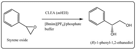 Cross-linked enzyme aggregates (CLEAs) of mung bean epoxide hydrolases (mbEH) has been used to catalyze the asymmetric hydrolysis of styrene oxide in a water-ionic liquid biphasic system (Scheme 8) []. Styrene oxide remains dispersed in the ionic liquid [bmim][PF6] and the hydrolysis product, (R)-phenylethanediol ((R)-PED), was obtained in the aqueous phase, facilitating its easy separation from starting material and avoiding non-enzymatic hydrolysis. On a 500 mL preparative scale the yield of (R)-PED was 49% in 94.6% enantioselectivity.