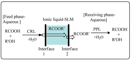 Miyako et al. have subsequently demonstrated a lipase-facilitated transport of organic acids across SLMs employing ionic liquids as transport solvents (Scheme 9) []. Based on this technology, organic acids were esterified by Candida rugosa lipase (CRL) in the feedstock phase with the resulting ester partitioning into the ionic liquid phase in the SLM and then diffusing into a receiving phase that contained a porcine pancreatic lipase (PPL) to hydrolyze the ester back to the initial organic acid. Accumulation of organic acids in the receiving phase was not observed in the absence of CRL due to their poor solubility in the ionic liquid used to construct the SLM. The use of ionic liquids as transport solvents also enabled long-term stability of the SLM compared to conventional organic solvent.